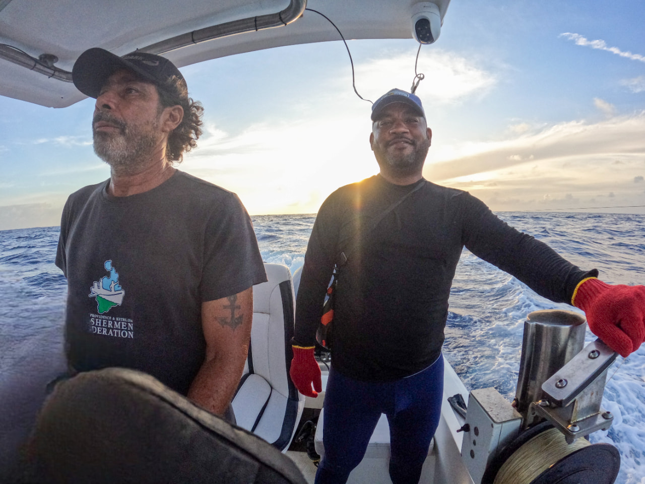 Son las 5:45 a.m y las estrellas se van apagando mientras empieza a salir el sol en Serrana. El sistema satelital skylight restablece la conexión de la base con el resto del mundo. Es una pieza fundamental para el monitoreo y vigilancia del maritorio. El Raizal Spring The Revolution prende sus motores pues harán una faena de pesca antes de volver por nosotros para continuar con la expedición.